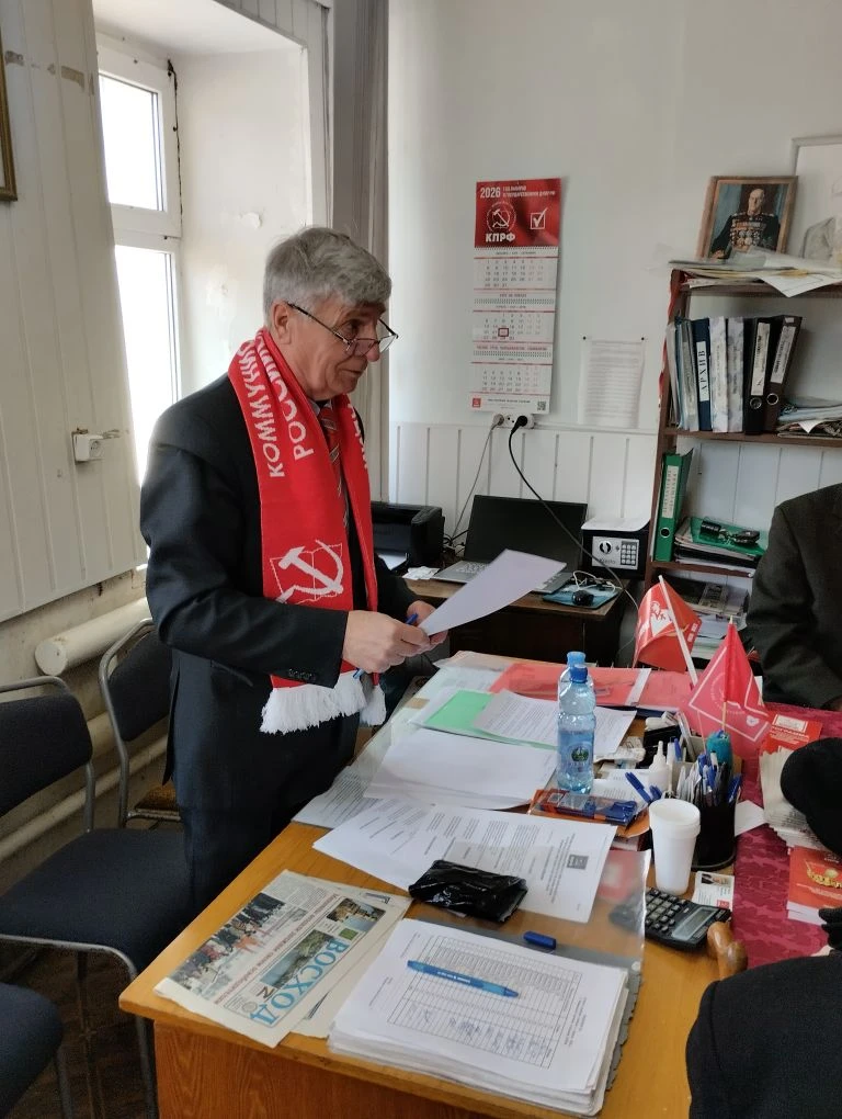 На собрании были рассмотрены заявления А.Е. Чуднова и И.В. Шишкина о приеме их в члены КПРФ. После того, как они ответили на вопросы, коммунисты единогласно приняли их в члены КПРФ. Н.В. Иванов поздравил их с приятием в ряды КПРФ и вручил им значки КПРФ. Таким образом, партийная организация увеличилась на 2 человека.